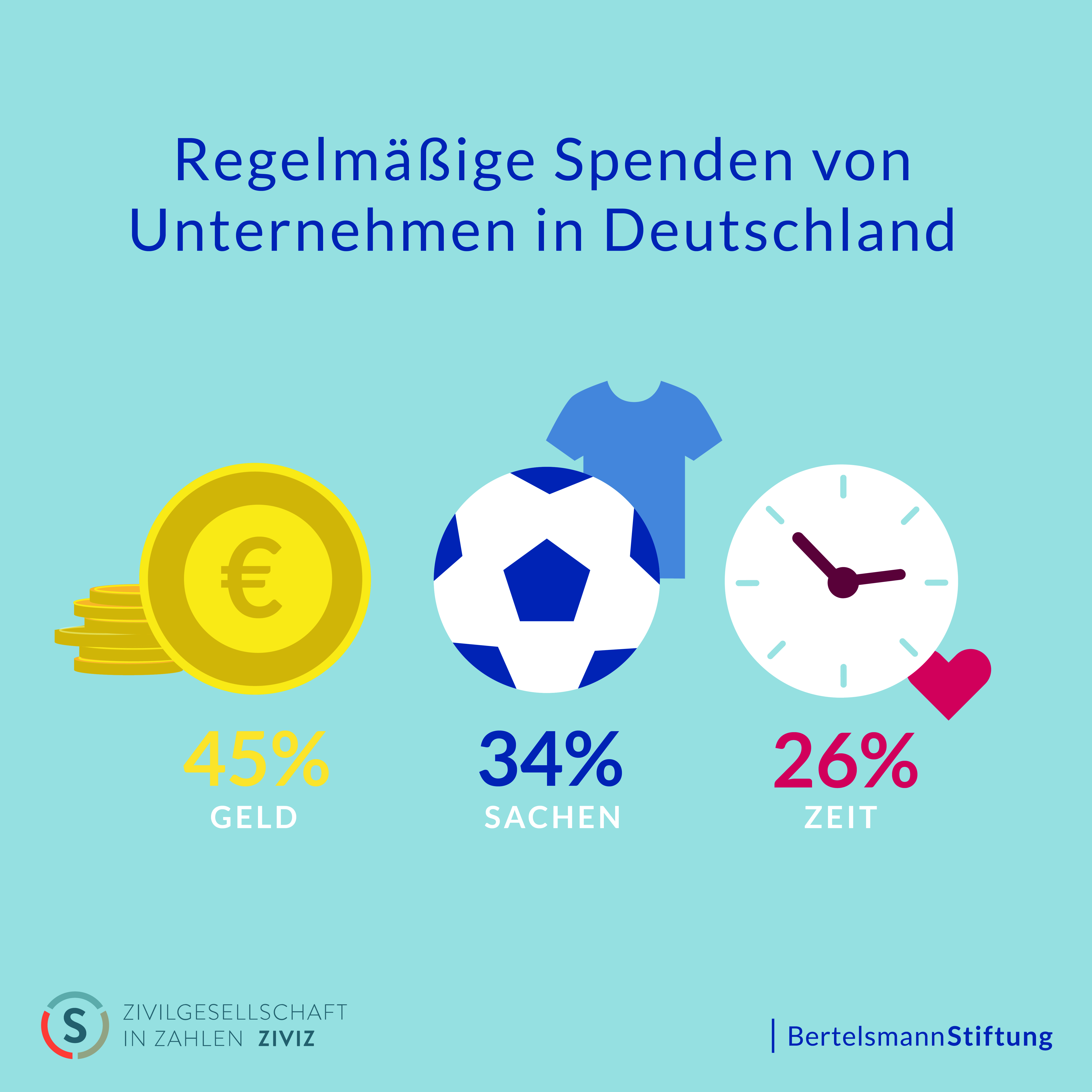 Der CC-Survey 2018 von Bertelsmann Stiftung und Stifterverband zeigt: Je mehr Mitarbeiter das Unternehmen hat, desto regelmäßiger spendet es Geld, Zeit oder Sachen. Am häufigsten spenden Finanz- und Versicherungsfirmen Geld. Bei den Zeitspenden belegt die Gesundheits- und Sozialbranche den ersten Platz und bei den Sachspenden liegt der Bergbau- und Metallsektor vorn. Über alle Größenklassen, Branchen und Regionen hinweg ist die Geldspende die am weitesten verbreitete Form von Unternehmensengagement.