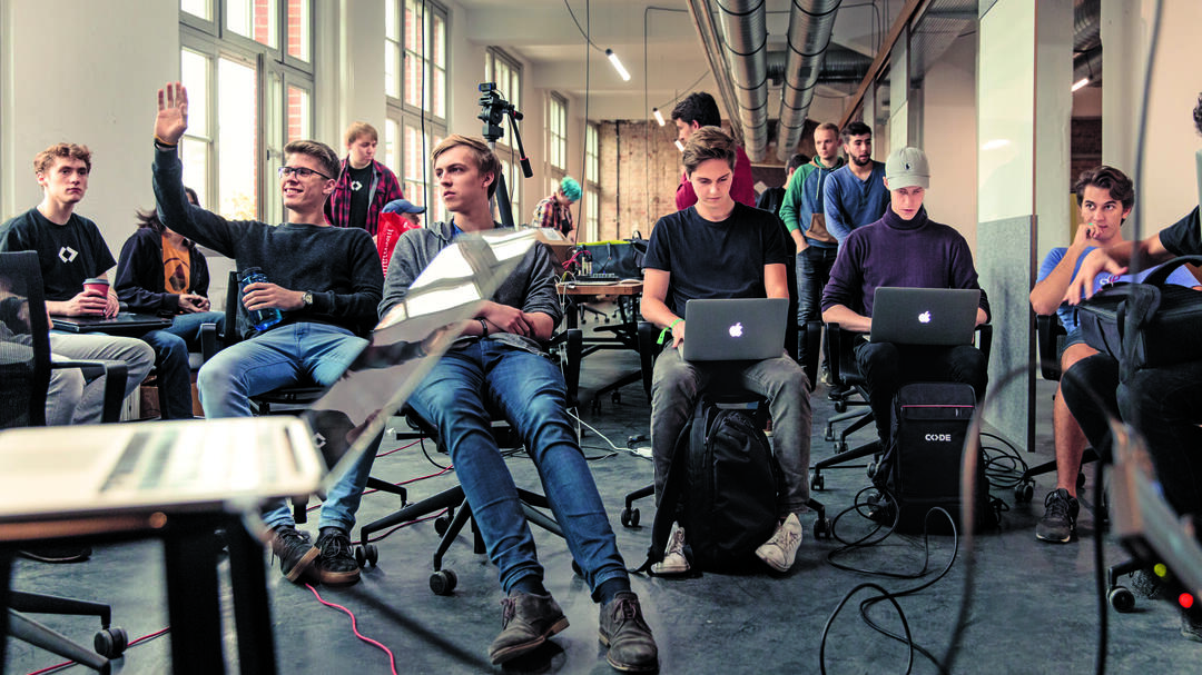 Wer Manuel Dolderer hinterherläuft durch seine Hochschule, der verliert mit jedem Schritt eines der Vorurteile darüber, wie die akademische Welt funktionieren muss. Der Blick öffnet sich in einen riesigen Raum, an der Decke hängen die silbern glänzenden Rohre der Klimaanlage und Dutzende Stromkabel, die sich farbig vom Sichtbeton abheben. Dolderer steigt über die Kisten, die gerade ein Paketdienst angeliefert hat, und zeigt auf die gläsernen Räume, die sich rechts an der Fensterfront aneinanderreihen: Auf Knopfdruck schieben sich die Türen auf, dahinter jeweils ein Konferenztisch und ein riesiger Bildschirm für Präsentationen. Auf der anderen Seite stehen wild durcheinandergewürfelt Designersessel, an die ein Arbeitstisch angebaut ist, der gerade groß genug für einen Laptop ist. „Mit dem, was wir hier machen“, sagt Dolderer, „haben wir einen Nerv getroffen.“