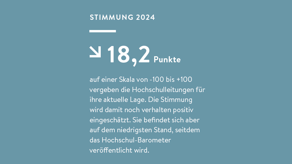 Im Stimmungsbarometer zeigt sich, dass die Hochschulleitungen den gegenwärtigen Zustand ihrer Einrichtungen zunehmend kritischer einschätzen. Finanzierungsengpässe, anhaltender Personalmangel und Sanierungsstau belasten die Hochschulen erheblich. Der Lage-Index fällt auf den niedrigsten Stand seit Beginn der Erhebung 2011. Nur die Kooperationsbeziehungen zeigen Stabilität und werden weiterhin als Stärke gesehen. Die Ergebnisse verdeutlichen, dass die Hochschulen in einer Situation begrenzter Spielräume agieren, in der Resilienz und Anpassungsfähigkeit zur zentralen Ressource werden.