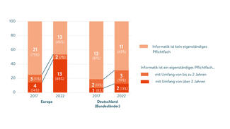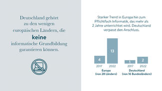 Zwar wollen sich Schleswig-Holstein, Saarland und Niedersachsen an die europäische Entwicklung anschließen und ab dem Schuljahr 2023/24 nach und nach Informatik flächendeckend als Pflichtfach einführen. Auch Hamburg will ab dem Schuljahr 2024/25 nachziehen. Trotzdem droht Deutschland im europäischen Vergleich weiter zurückzufallen. Seit dem Jahr 2017 haben rund ein Drittel der europäischen Länder ein Pflichtfach Informatik von mehr als zwei Jahren eingeführt, beispielsweise die Schweiz, Tschechien, Lettland oder Litauen. Der Anteil liegt jetzt bei 46 Prozent. In Deutschland hat sich ein solches Angebot von einem Bundesland auf zwei Bundesländer erhöht. Nur Mecklenburg-Vorpommern und Sachsen bieten ein Pflichtfach Informatik an, das sich über mehr als zwei Schuljahre erstreckt.